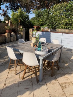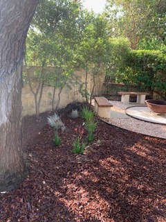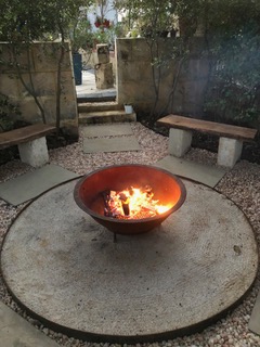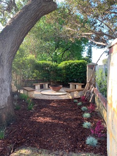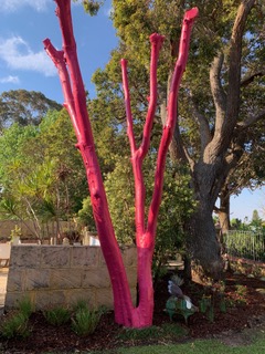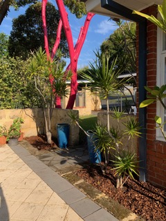 This client wanted to update the garden surrounding their delightful Mid Century Modern home from a space where young children once played on a trampoline and a cubby house to a low maintenance garden where teenage boys would be encouraged to bring friends home and gather around the fire pit. We decided to paint a dead Jacaranda tree pink, rather than remove it. This suits the shades of pink glass across the front of the home and adds artful interest to the garden.