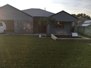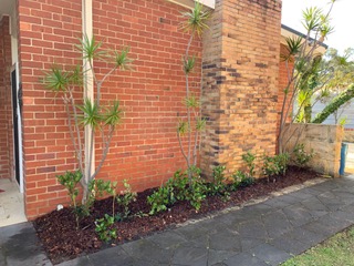 This stunning new Giorgi Exclusive Homes build has brick accents reminiscent of Frank Lloyd Wright designs. The home sits high upon a hill in a very windy spot with stunning a sea view which needed to be preserved and not blocked by trees. The brief was lush, low maintenance with flowing lawns. Garden beds in planter boxes created an opportunity to use colour accents like Nandina ‘Obsession’. Magnolias Teddy Bear and Philodendrun Xanadu work well planted in raised beds around the swimming pool. Ficus Pumila is used to cover a large white wall along the driveway to soften the starkness of the white. Lagertromia natchez provide graceful shade and structure along the front of the home as well a vigorous informal hedge of Viburnum Emerald Lustre which offers privacy to bedrooms along the front of the home.